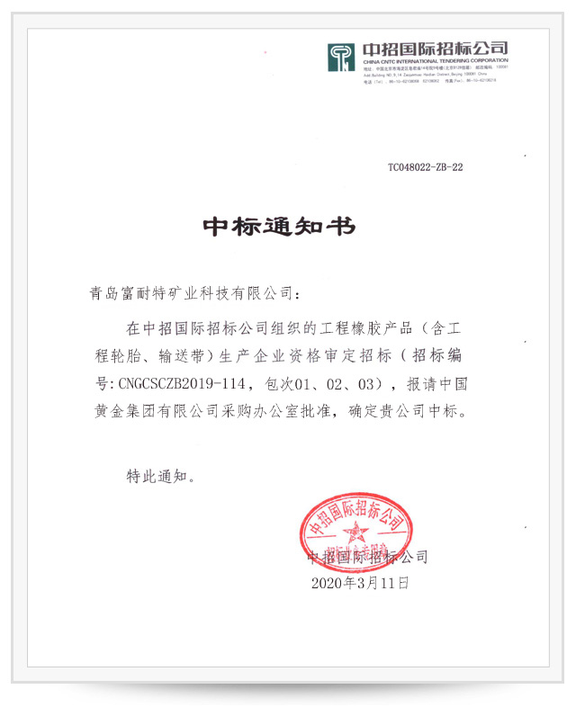 日前中国黄金集团有限公司(以下简称中国黄金)召开招标会议,组织中国黄金所属14家企业通过电子商务形式招标采购所需的工程橡胶产品。青岛91免费观看网站矿业科技有限公司以不俗的实力“连中三元”,中标中国黄金集团2020年度三大类别橡胶产品。