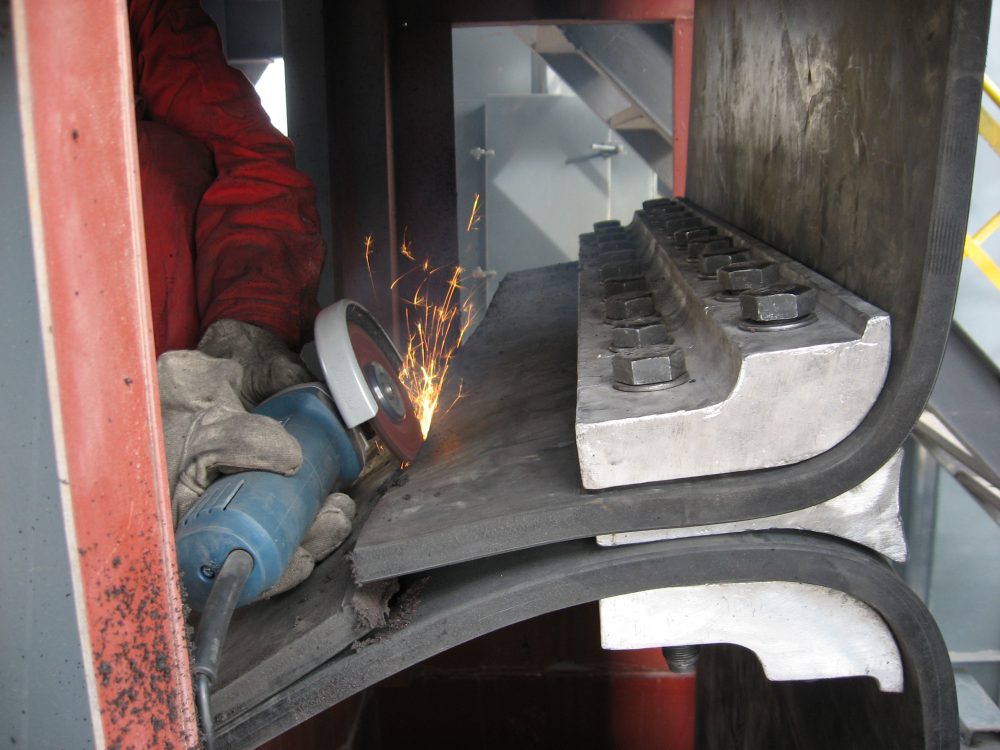 斗提升机输送带为条带状结构,装配时需要采用夹具,将胶带的两个端部连接固定成为环状,实现在滚筒带动下连续运行。